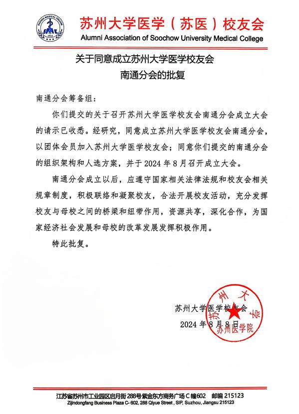 你们提交的关于召开苏州大学医学校友会南通分会成立大会的请示已收悉。经研究,同意成立苏州大学医学校友会南通分会,以团体会员加入苏州大学医学校友会;同意你们提交的南通分会的组织架构和人选方案,并于2024年8月召开成立大会。