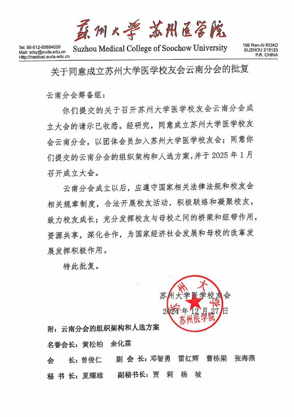 你们提交的关于召开苏州大学医学校友会云南分会成立大会的请示已收悉。经研究,同意成立苏州大学医学校友会云南分会,以团体会员加入苏州大学医学校友会;同意你们提交的云南分会的组织架构和人选方案,并于2025年1月召开成立大会。