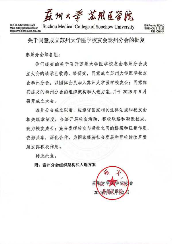 你们提交的关于召开苏州大学医学校友会泰州分会成立大会的请示已收悉。经研究,同意成立苏州大学医学校友会泰州分会,以团体会员加入苏州大学医学校友会;同意你们提交的泰州分会的组织架构和人选方案,并于2025年9月召开成立大会。