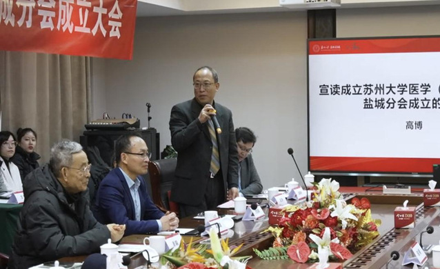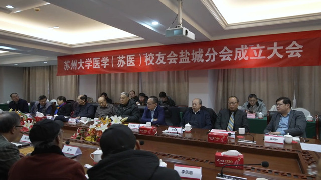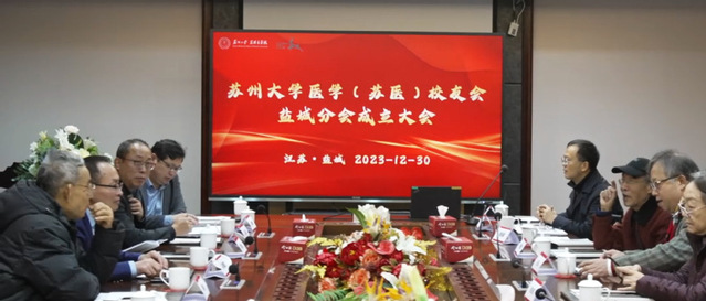 2023年12月30日上午,苏州大学医学校友会盐城分会成立仪式在盐城宏派国际大酒店举行。医学校友会执行会长顾钢,苏州苏医医学教育发展基金会理事长夏东民,医学校友会副秘书长高博,医学校友会苏州分会名誉会长张月芳、缪竞诚,医学校友会苏州分会副会长兼秘书长、苏州西山生物和苏州精准医疗共同创始人时长军等赴盐城参加活动。苏州大学苏州医学院党工委副书记吴德建、南通理工学院健康医学院院长倪衡建、《杏林流芳》执行主编顾闻钟应邀出席成立仪式。盐城地区张瀛(1962级)、李承惠(1963级)、曹桂华(1965级)等五十余位校友参加了线上、线下活动。仪式由1997级校友钱长春主持。