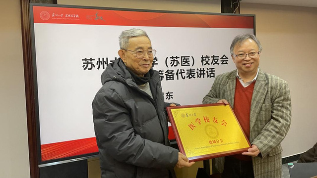 医学校友会执行会长顾钢授牌,盐城分会会长吕东代表分会接受匾牌。